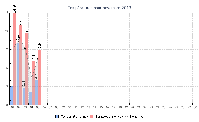 | 01 | 3.1 °C | 14.9 °C | 9.0 °C | 0.9 km/h (6.5 km/h) | SSE |